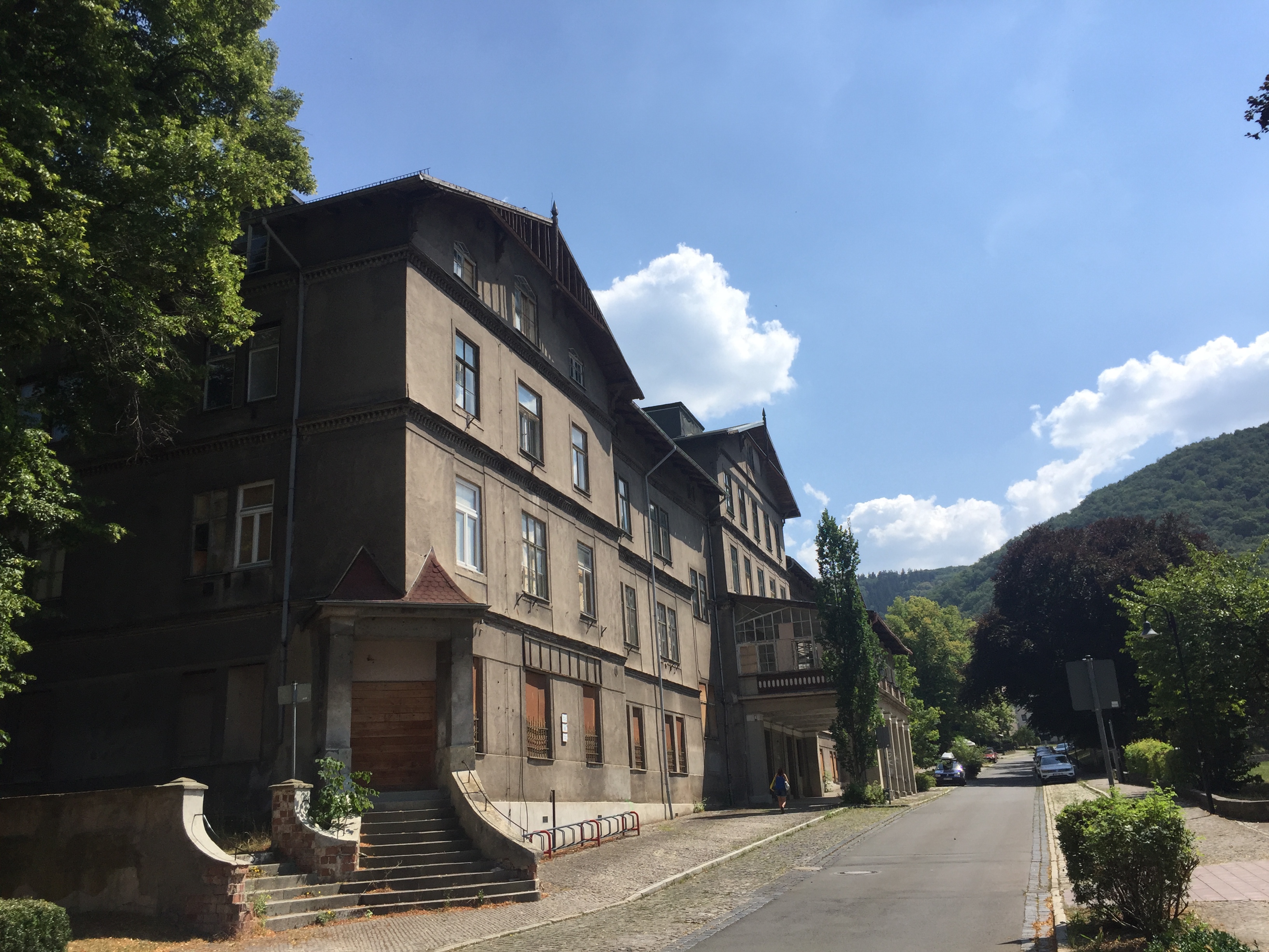 Nachdem wir nun einen Tag etwas kürzer getreten sind, können wir uns mit vollem Elan der wohl anstrengendsten Etappe unserer Reise widmen, dem Besuch Thales, und damit sehen wir wenigstens ein kleines, wenn auch bedeutendes Stück vom Harz. Wir haben uns schon vor einigen Tagen erkundigt, wie man dort am besten hinkommt und erfahren, dass alle halbe Stunde ein Bus nach Thale fährt und wir wegen der von uns entrichteten Kurtaxe sogar umsonst mitfahren dürfen. Also schnüren wir unsere Schuhe, die Mutter präpariert ihr Knie (Voltaren ist neben der Cécile unser zweiter ständiger Begleiter) und auf geht‘s zum Bahnhof, um unser Ziel noch vor der großen Hitze zu erreichen. Dort angekommen, erfahren wir, dass der Bus ca. 40 Minuten braucht, abhängig vom Verkehr, wohingegen der Zug die Strecke in 10 Minuten zurücklegt. Wir entscheiden uns für den Zug, denn wir sind ja auf Céciles Spuren, welche auch mit dem Zug anreiste, nur in umgekehrter Richtung. Außerdem scheinen 40 Minuten in einem immer heißer werdenden Bus unserem heutigen Reiseziel nicht sonderlich zuträglich zu sein. Zehn Minuten später sitzen wir also im angenehm klimatisierten Zug und nach drei Zwischenhalten, unter anderem Neinstedt, welches wir, als aufmerksame Leser und weil wir ja aus Quedlinburg kommen, nicht mit ebenjenem verwechseln können. So steigen wir also kurze Zeit später aus und werden des majestätischen Anblicks des sich erhebenden Harzes, der jedem Zugreisenden gegönnt ist, gewahr. Kaum treten wir aus dem Bahnhof heraus, der übrigens renoviert ist, auch wenn die orangefarbenen Türen nicht so recht zu dem taubenblauen Fachwerk passen möchten, so fallen wir gleich auf das Hotel Zehnpfund.