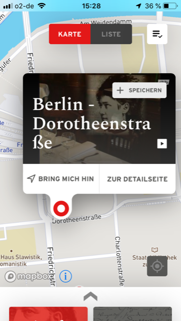 Einzig die Pushnachrichten scheinen ihre Funktion nicht recht zu erfüllen, das kann aber durchaus auch an der Geschwindigkeit der S-Bahn liegen, wenn sie am Friedhof vorbeifährt. Insofern wird es Zeit für ein Feldversuch, ein Blick auf die Karte verrät mir, dass sich gleich in der Dorotheenstraße ebenfalls ein für Fontanes Leben relevanter Punkt befindet, also statte ich diesem einen Besuch ab.